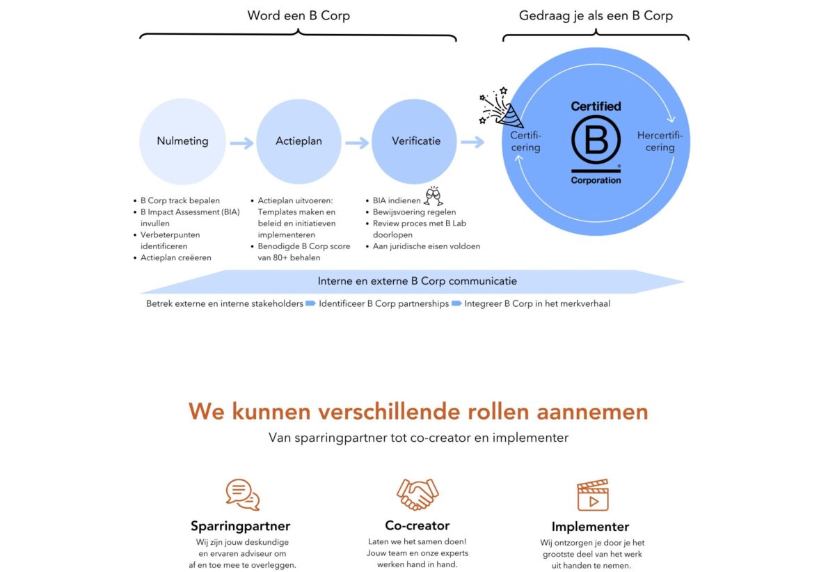 Als gecertificeerde B Corp kennen we alle ins en outs van de B Corp-reis. We hebben een stevig trackrecord opgebouwd in het begeleiden van het B Corp-trajecten bij kleine, middelgrote en grote bedrijven. Lees hier meer over onze service.