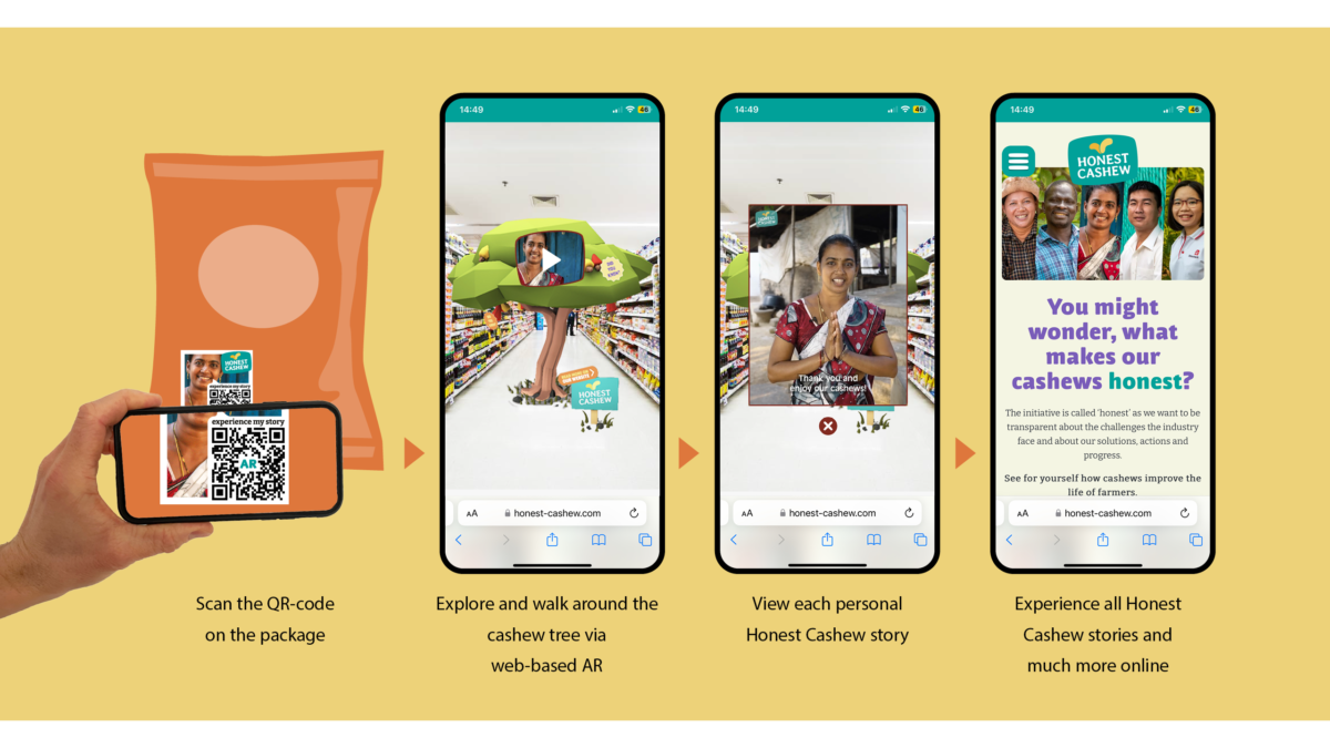 Voor de consumentencampagne en private labels ontwikkelden we ‘s werelds allereerste web-based AR experience. Scan de QR-code op de verpakking en plant je eigen cashewboom, waar je ook bent. Ontdek interessante feiten rondom de boom en bekijk de Honest Cashew-verhalen, persoonlijke video’s van mensen in de supply chain. Deze verhalen leiden naar de website, waar je de reis van je cashew kunt volgen en meer informatie vindt.