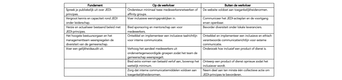 Met de gestructureerde aanpak van JEDI kun je als organisatie echt iets veranderen — door drempels weg te nemen voor groepen die structureel zijn achtergesteld, en bij te dragen aan een wereld waarin iedereen mee kan doen, op het werk en daarbuiten.