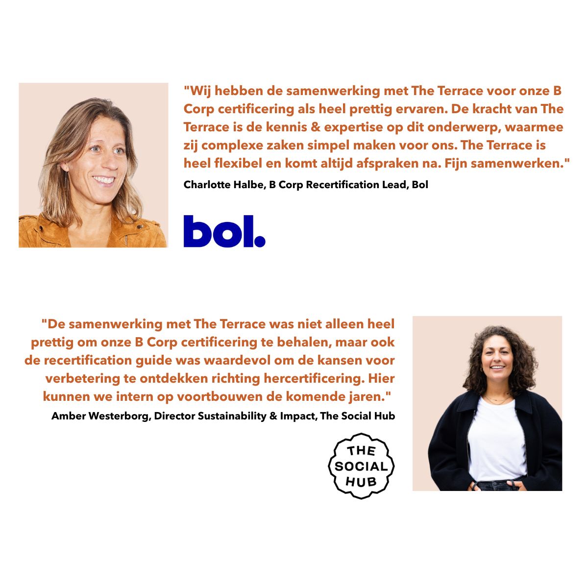 Sinds 2018 zijn wij een trotse B Corp en B Corp Way Partner. Ons team van ervaren B Leaders begeleidt zowel grote als kleine bedrijven succesvol naar certificering. Of je nu een multinational of een MKB-bedrijf bent, wij maken het certificeringsproces helder en haalbaar. We geven eerlijk advies over jouw kansen en begeleiden je stap voor stap.